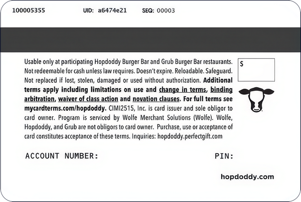 Your Hopdoddy Burger Bar (the “Gift Card”) are redeemable by card owners up to the available card balance only to purchase goods and/or services only at participating Hopdoddy Burger Bar and Grub Burger Bar locations. As used throughout, the term “Hopdoddy” refers to HiBar Hospitality Operations doing business as Hopdoddy Burger Bar and Grub Burger Bar. The Gift Card is issued by CIMI2515, Inc. It is subject to terms and conditions. Complete terms and conditions are provided on the Full Gift Card Terms tab of this site (the “Terms”). The Terms include a limitation of liability clause, a change of terms provision, a binding arbitration clause, a waiver of class action provision, and a novation clause. Purchase, use or acceptance of the Gift Card constitutes acceptance of these Terms.