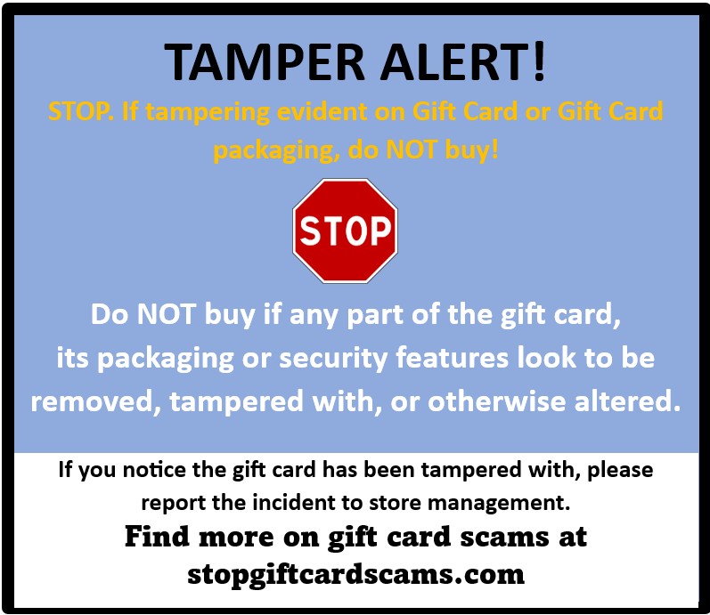Gift Card tampering is a major fraud scheme. Fraudsters remove a card from a sales rack. They tamper with the packaging, steal one or more card number(s), and return the card to the rack. They then wait until a purchaser buys the card. When it is activated upon sale, they deploy the stolen card numbers to use the card and drain its value resulting in the purchaser holding a valueless card. Consumers can fight back. Be vigilant when buying gift cards. Examine the card and packaging. DO NOT SELL OR PURCHASE IF PACKAGING HAS BEEN BROKEN OR INDICATES TAMPERING. Education and awareness are the keys. Visit stopgiftcardscams.com.