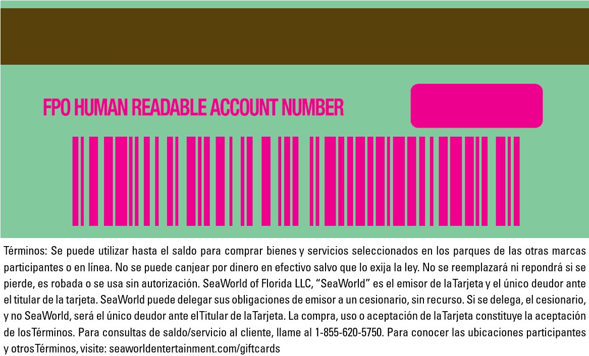 Su Tarjeta de Regalo SeaWorld (la “Tarjeta de Regalo”) puede ser utilizada por los titulares para canjes hasta el monto del saldo disponible solo para comprar cualquier producto o servicio en las ubicaciones de las marcas participantes. La Tarjeta de Regalo es emitida por SeaWorld of Florida, LLC. Está sujeta a términos y condiciones. La compra, uso o aceptación de la Tarjeta de Regalo constituye la aceptación de estos Términos.