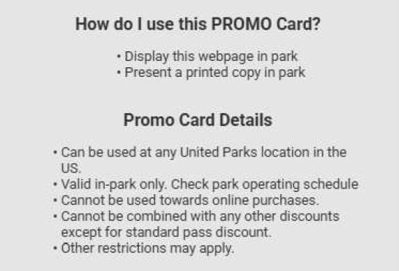 - The $20 Promo Digital Card is redeemable only in-park at participating United Parks properties. Your promo gift card is not redeemable at other merchants or for on-line purchases.