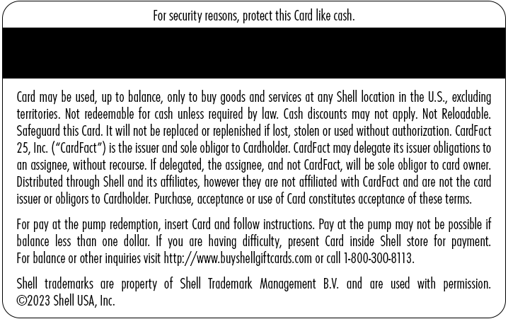 Card may be used, up to balance, only to buy goods and services at any Shell location in the U.S., excluding territories. Not redeemable for cash unless required by law. Cash discounts may not apply. Not Reloadable. Safeguard this Card. It will not be replaced or replenished if lost, stolen or used without authorization. CardFact 25, Inc. (“CardFact”) is the issuer and sole obligor to Cardholder. CardFact may delegate its issuer obligations to an assignee, without recourse. If delegated, the assignee, and not CardFact, will be sole obligor to card owner. Distributed through Shell and its affiliates, however they are not affiliated with CardFact and are not the card issuer or obligors to Cardholder. Purchase, acceptance or use of Card constitutes acceptance of these terms. For pay at the pump redemption, insert Card and follow instructions. Pay at the pump may not be possible if balance less than one dollar. If you are having difficulty, present Card inside Shell store for payment. For balance or other inquiries visit http://www.buyshellgiftcards.com or call 1-800-300-8113. Shell trademarks are property of Shell Trademark Management B.V. and are used with permission. ©2023 Shell USA, Inc.