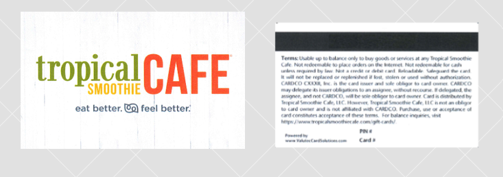 CARDCO CXXXII, Inc., the Issuer of some of the Gift Cards in the Tropical Smoothie Cafe® Gift Card program, has changed its name to CIMI2517, Inc. CIMI2517, Inc. is the Card Issuer of the Gift Cards under this program. To view the Terms of the Gift Cards issued under the CARDCO CXXXII, Inc. name you can visit: Tropical Smoothie Cafe® CARDCO Gift Cards.